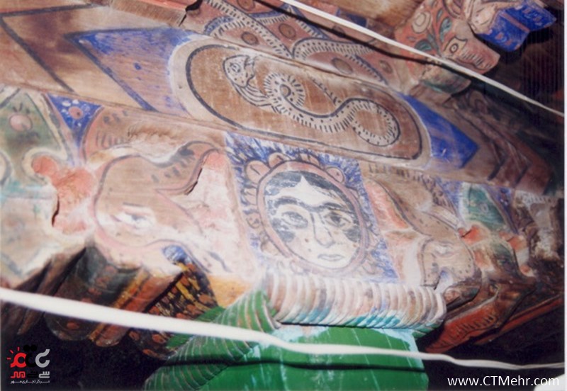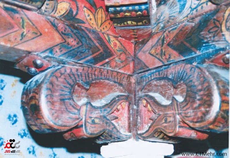 سر ستونهای چوبی به فرم دهان اژدها هستند که ارتباط بین تیرهای افقی و عمودی بنا را میسر میکنند.