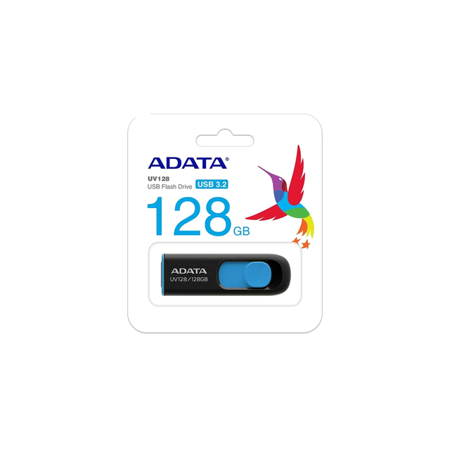 DashDrive UV128 یک فلش مموری با طراحی کشویی و باریک است که از سرعت رابط USB 3.0 نیز بهره میبرد. طراحی بدون درپوش این فلش مموری، نگرانی گم شدن درپوش فلش مموری را در شما از بین میبرد و دیگر لازم نیست شما نگران این مورد باشید. رابط USB 3.0 قابلیت انتقال دوکاناله دارد و قادر است سرعت خواندن فلش مموری را حداکثر تا 90 و نوشتن را حداکثر تا 40 مگابایت بر ثانیه بالا ببرد و این در حالی است که فلش مموری با رابط USB 2.0 نیز سازگاری کامل دارد. فلش مموری Adata DashDrive UV128 به صورتی طراحی شده تا هنگامیکه شما با آن کاری نداشته باشید رابط USB بهصورت کشویی در داخل بدنه فلش قرار بگیرد تا آسیبی نبیند و در هنگامیکه شما به فلش مموری نیاز داشتید به راحتی میتوانید آن را بهصورت کشویی به حالت استفاده دربیاورید. طراحی بدنه مات این فلش مموری، ضد خش و ضد گرد و خاک بودن را برای آن به ارمغان آورده است. فلش مموری UV128 در دو رنگ مشکی_آبی و مشکی_زرد طراحی و تولید شده و در دسترس قرار دارد. در انتهای این فلش مموری یک شیار طراحی شده است که به شما این امکان را میدهد تا یک بند به انتهای فلش مموری متصل نمایید تا حمل و نقل آن آسانتر شود و ضریب گم شدن آن نیز کمتر شود، همچنین میتوانید فلش مموری را به دستهکلیدتان متصل نمایید