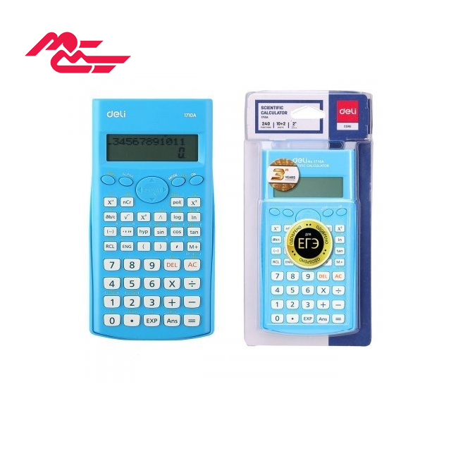 ماشین حساب مهندسی دلی مدل 1710 یک مدل حرفه ای دارای صفحه نمایش بزرگ 2 سطری با قابلیت نمایش 10+2 رقم (12 رقم در سطر بالا و 10 رقم در سطر پایین) می باشد. صفحه کلید و کاور پشت محصول از پلاستیک نرم و روان با ماندگاری بالا ساخته شده است. این ماشین حساب علاوه بر دکمه خاموش OFF مجهز به سیستم خاموشی خودکار نیز می باشد. کلید تغییر حالت Shift، کلید حروف Alpha، کلید های جهتی، کلید حذف آخرین ورودی Del، کلید های Rnd، Mode، RCL، ENG و ... همگی امکانات گسترده ای را در اختیار شما قرار می دهند. می توانید محاسبه توابع مثلثاتی (sin , cos , tan)، توابع هایپربولیک (sinh , cosh , tanh)، توان و لگاریتم (Log,^)، -/+ و →، عملیات درصد گیری (%)، فاکتوریل (!)، جذر (√)، تابع مولد (Rnd)، تفکیک ارقام بصورت سه رقمی، قابلیت برگشت و ... را انجام دهید.
